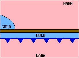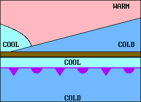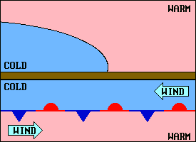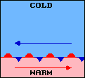 ![]() | Sometimes along stationary or slow moving cold fronts, a frontal wave develops. A typical situation in the U.S. is illustrated here. The wave produces a cold front to the left and a warm front to the right and a low pressure center develops at the peak of the wave. The faster moving cold front may overtake the warm front and produce an occlusion near the low. |