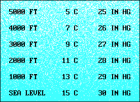 | Although the composition of air doesn't change with altitude, its temperature and pressure do. In general, both decrease with altitude, but the rate of decrease can vary, so something called the "standard atmosphere" was created to provide a reference point for actual observations. The sea level standard is: Pressure 29.92 in. Hg or 1013.2 millibars, Temperature 15.0oC or 59oF. For our purposes, we can assume that pressure decreases one inch of mercury (Hg) per 1,000 feet, and temperature decreases two degrees Celsius (C) per 1,000 feet. We refer to these rates of change as "lapse rates". They are reasonable estimates for use in the troposphere, but the temperature lapse rate changes abruptly at the tropopause. |