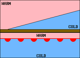 ![]() | A warm front is one in which a warm air mass is replacing a colder one. The shallow slope typical of a warm front is shown in the upper illustration and its weather map symbol is shown below. The type of weather associated with a warm front depends on the stability of the warm air, and it usually covers a much larger area than that associated with a cold front. If the temperature of the cold air is below freezing, rain falling from the warm air above may freeze before reaching the surface. "Ice pellets always indicate freezing rain at higher altitude." (2) |